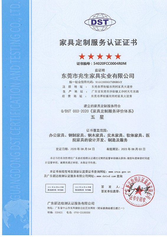 依据标准进行家具定制服务评价时,对各项指标采取评分的方法,满分为150分,家具定制服务认证证书分为一星级、二星级、三星级、四星级、五星级等级认证,五星级为最高等级认证。