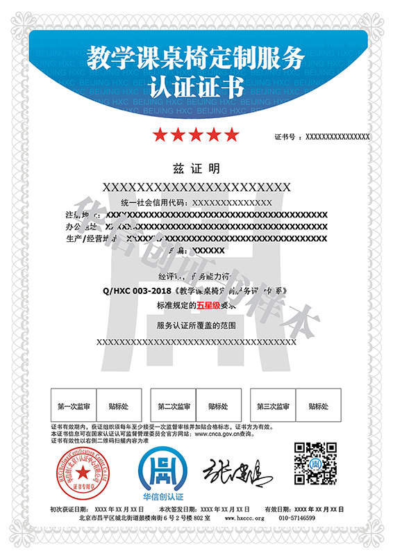 教学课桌椅定制服务认证证书分为一星级、二星级、三星级、四星级、五星级等级认证,五星级为最高等级认证。